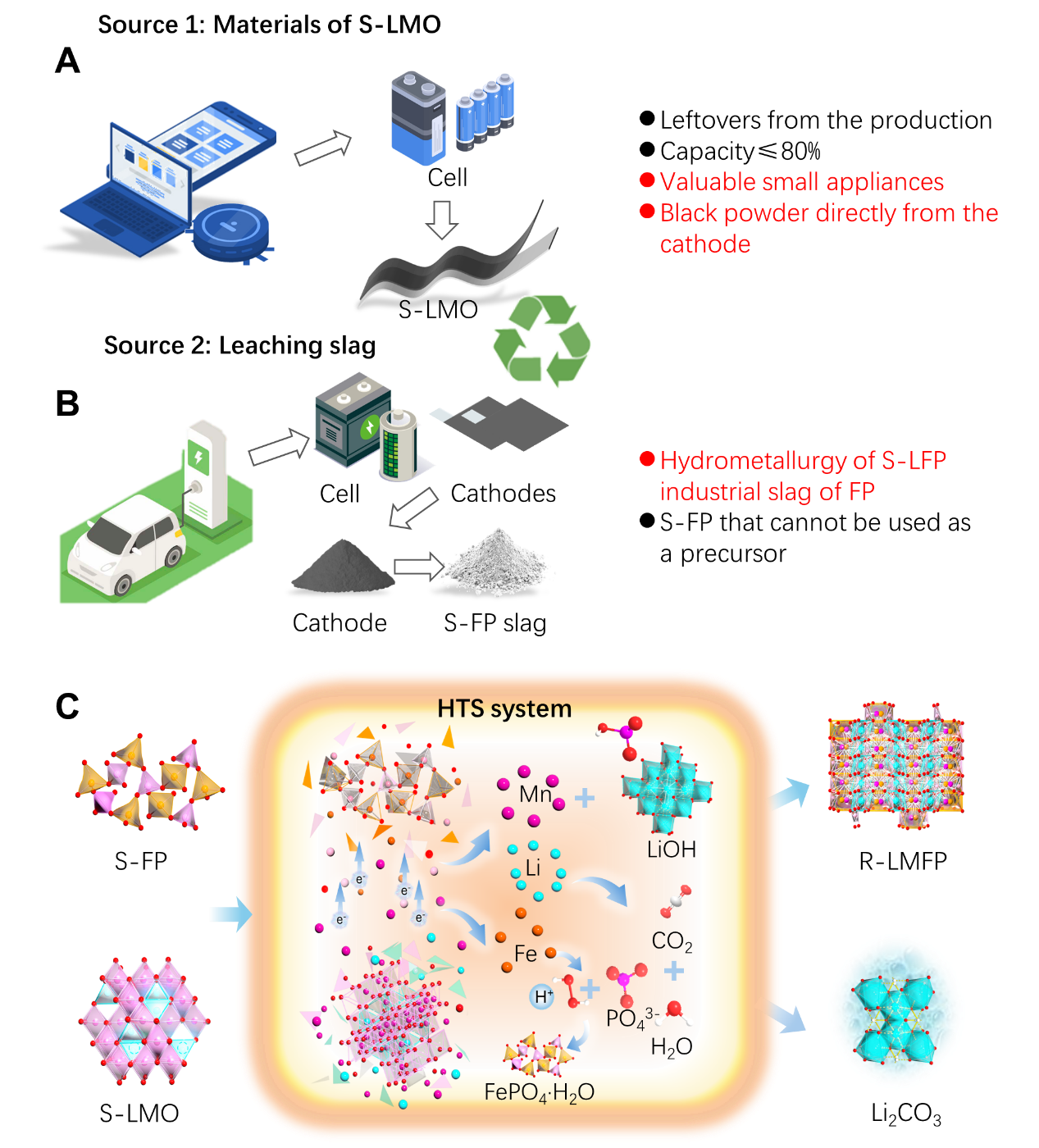 随着锂电池退役量的持续攀升,其清洁回收技术被视为新能源产业健康发展的保障,回收策略在学术界和产业界成为关注的焦点。目前,退役锂电回收的研究重点是湿法冶金或加热直接修复,主要侧重于金属高效提取或恢复原有电池性能,但对阴极材料的高价值特性探索有限。因此焦耳加热技术作为一种革命性的回收方法体系,为退役锂电阴极材料的高价值利用提出了创新的概念。 近日,中国科学院广州能源研究所袁浩然研究员团队联合中国科学院过程工程研究所杨军研究员在Matter上发表了题为High Performance Phosphate Cathode from Revitalizing Spent Battery Slag via Joule-Heating的研究论文。该研究提出了针对退役LiMn2O4电池阴极材料(S-LMO)与浸出渣磷酸铁(S-FP)的协同处置技术:通过焦耳高温冲击活化水浸,实现金属锂的快速浸出(Li浸出率>99%);进一步调整焦耳热参数,对S-LMO和S-FP进行结构调整和过渡金属替换,升级回收为高能量密度的聚阴离子阴极材料LiMnFePO4(R-LMFP)。该策略不仅大幅缩短了退役锂电池阴极材料回收锂的时间,更显著提升了LMFP阴极材料的合成效率,为解决退役锂电池阴极材料与浸出渣的协同处置提供了全新思路。