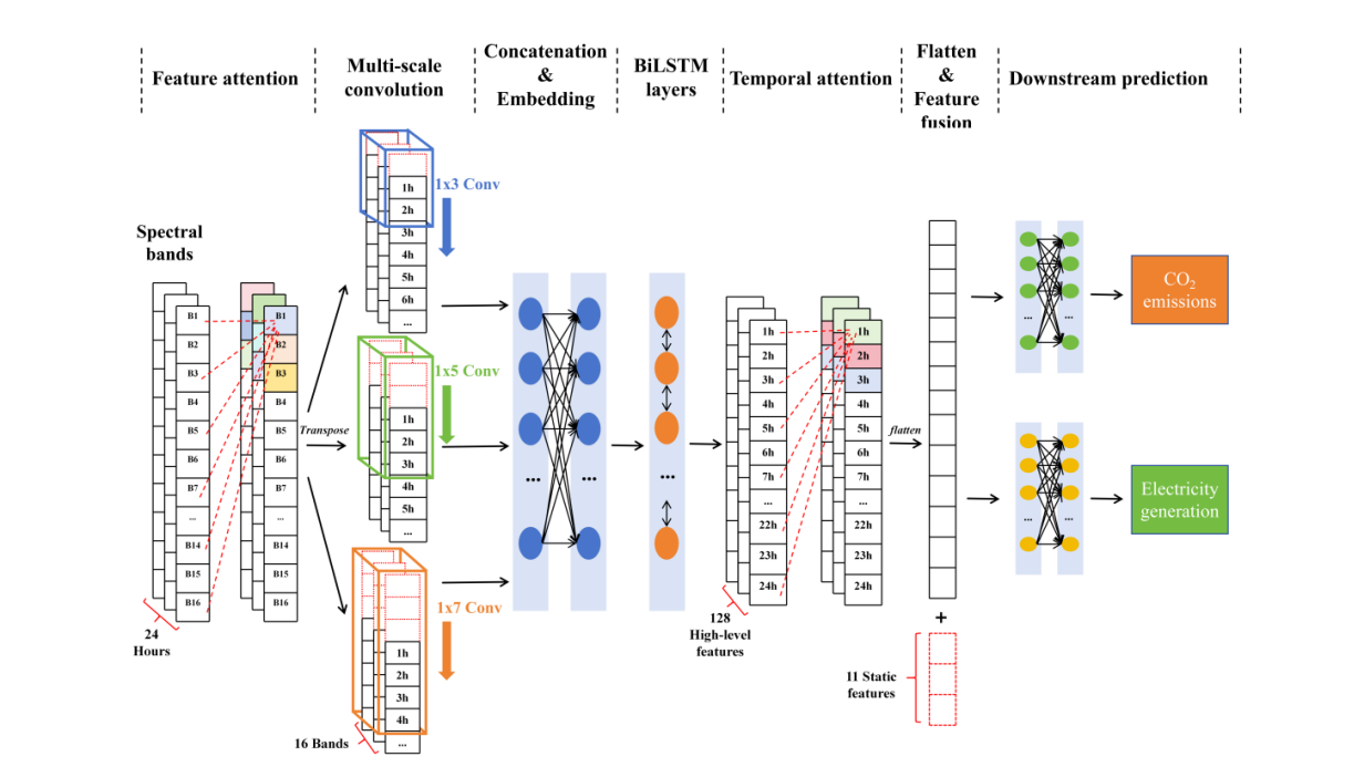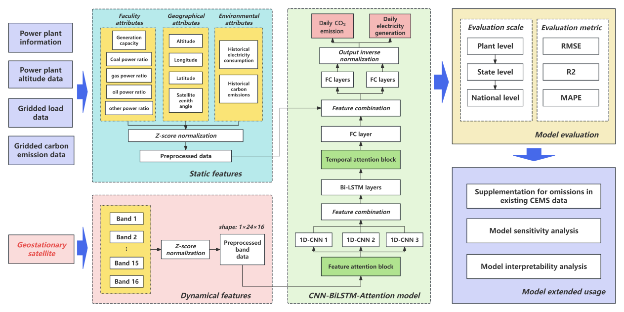 研究人员以美国环境?;な鸸芾淼幕鸬绯芯慷韵螅捎肎OES-16地球静止卫星提供的多光谱遥感数据及火电厂相关静态信息作为模型输入,以火电厂日尺度的碳排放与发电量数据为预测目标,构建端到端的监测框架。在算法设计上,模型融合了卷积神经网络、双向长短期记忆网络和特征与时间双重注意力机制,显著提升了模型测算的准确性与鲁棒性。