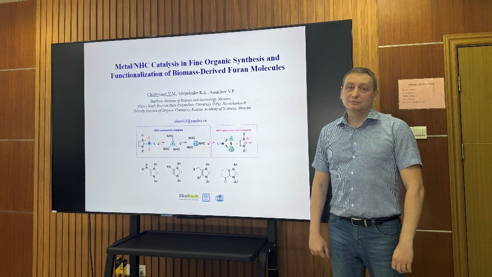 10月14日,Victor Chernyshev作了题为Metal/NHC Catalysis in Fine Organic Synthesis and Functionalization of Biomass-Derived Furan Molecules的专题学术报告。报告会由张宇主持,中心部分科研人员及学生参加。Victor Chernyshev系统介绍了NHC配体在金属催化中的关键作用,阐述了NHC-connected与NHC-disconnected催化机制,并分享了利用可电离阴离子配体提升NHC稳定性的策略。此外,他还详细展示了NHC在催化生物质衍生物(如糠醛和5-羟甲基糠醛)C5和C3位点实现高效、高选择性烷基化与芳基化等方面的最新研究进展。报告内容新颖深入,给在场从事生物质催化转化的科研人员带来了新的思路、思考方向以及有益的启发。在问答环节中,Chernyshev就与会者提出的多个专业问题进行了细致解答。