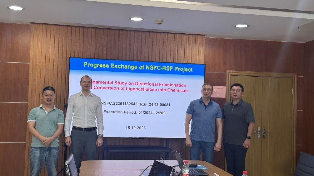 10月15日,双方围绕共同承担的NSFC-RSF项目“木质纤维素定向拆解转化为化学品的过程调控”召开了进展交流会,会议由亓伟主持?;嵘希琄onstantin Shepelenko代表俄方汇报了碳水化合物脱水制呋喃醛及NHC催化呋喃醛成呋喃酸酯等方面的研究进展,张宇代表中方介绍了木质纤维素DES预处理及NHC氧化酯化糠醛制备糠酸甲酯等方面的研究进展,与会人员就项目推进过程中存在的问题及解决方案进行了深入探讨,并就下一阶段的研究计划与目标达成共识。?